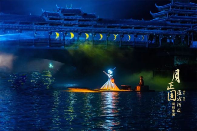 荣昌风雨桥上,“月色如歌”,苗家少女月月身着发光苗服,乘竹筏提灯轻轻地唱,游船上的人悠悠地和。游客们一边品尝着地道的苗家风味,一边沉醉于天籁歌声之中,当竹筏远去,在灯光与投影的交相辉映下,桥上的月亮逐渐隐现……“沉浸+互动+夜经济”,营造出前所未有的观演享受。
