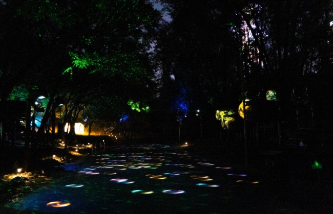 傍晚时分,我们走进“奇幻光影森林之山海幻境”,绚丽影像已铺满道路,而且不同路段有不同互动特效,漫步其上,或留下神兽足迹,或绽放绚丽花瓣,或带动水波涟漪……配合各种音效,让游览更具趣味。地面投影方案是此项目的一大亮点,由道路两侧的索尼VPL-P630HZ拼接融合而成,色彩绚丽,视效精美。