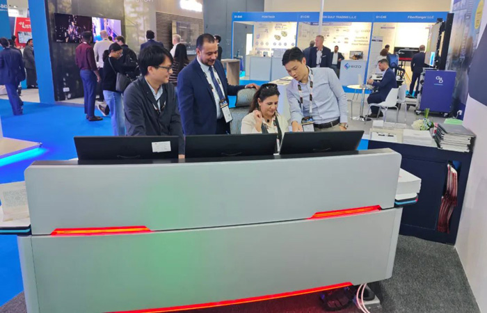 展会现场,充满未来感、科技感的智慧控制台吸引了海外客户沉浸式体验,照彰销售经理与客户英语交流并详细解答,将智慧控制台的智能化功能,设计理念,使用场景,匠心工艺,整体用材等一一介绍,产品深得海外客户的青睐!