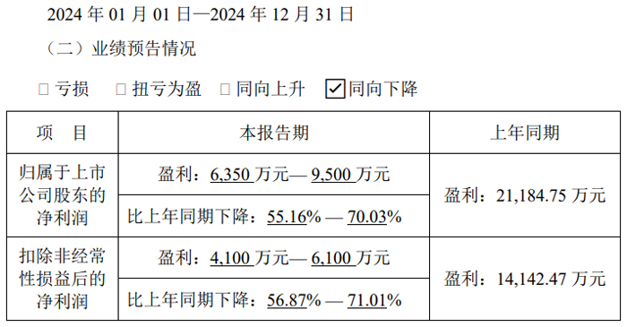 预计扣非净利润-16,000 万元到-21,000 万元,与上年同期(法定披露数据)相比,将减少 23,125 万元到 28,125万元,同比下降 325%到 395%。