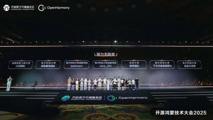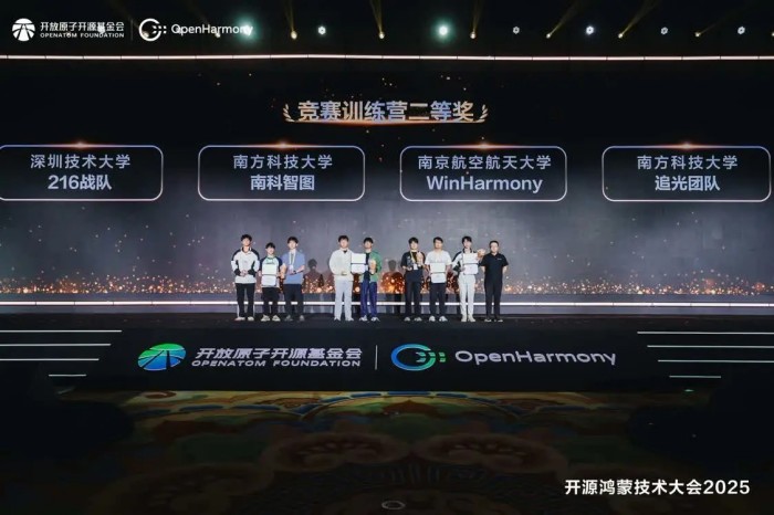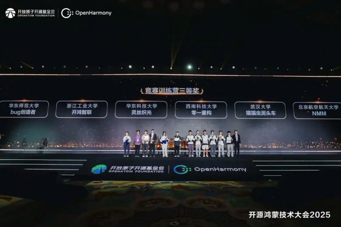 9月27日,开源鸿蒙技术大会2025在长沙国际会议中心圆满召开。作为大会的重要环节之一,开源鸿蒙竞赛训练营正式结营并举行颁奖典礼。开源鸿蒙项目群工作委员会和技术指导委员会的专家到场,为来自全国高校的19支获奖队伍颁奖,见证青年学子在开源赛道上的实践与突破。
