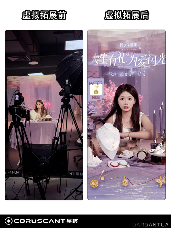 迎合七夕营销节点,周大生腕美XR直播间场景进行升级!围绕“大生有礼·为爱闪光”主题,结合莫奈花园系列产品的紫色视觉色彩,打造神秘浪漫的「仲夏幻梦」美景。直播互动聚焦腕间艺术,引入DIY串珠环节,感受能量哲学与视觉美学的双重碰撞,解锁别样腕上风采。