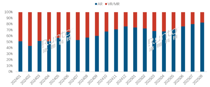 至今年8月,VR/MR设备在线上XR设备市场的月度占比已从2024年初的五成降至不足两成。