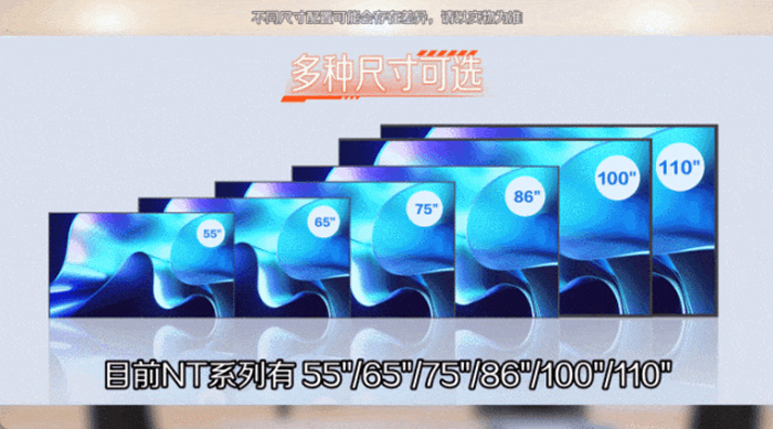 目前,智慧会议屏NT系列基于不同企业的办公需求,推出了55'/65'/75'/86'/100'/110'等不同的型号,最大程度满足不同规模企业的定制化要求。