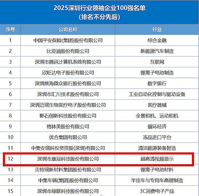 近日,由深圳市工商业联合会(总商会)、深圳报业集团指导,深圳市行业领袖企业发展促进会与深圳商报/读创客户端共同主办的“2025深圳行业领袖企业100强”评选结果出炉。康冠科技成功入选该榜单,彰显了公司在超高清视频显示领域的强劲实力,凸显了创新成果所带来的行业引领效应。
