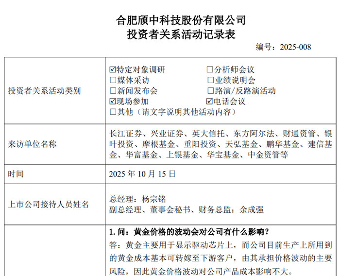 2025 年 10 月 15 日,合肥颀中科技股份有限公司(以下简称 “颀中科技”)以现场 + 电话会议形式举办特定对象调研活动,副总经理、董事会秘书、财务总监余成强,总经理杨宗铭共同接待来访。叶投资、摩根基金、重阳投资、天弘基金、鹏华基金等多家知名投资机构,以及长江证券、兴业证券等券商代表参与交流,公司就投资者关注的成本影响、费用测算、业务布局等关键问题逐一回应。