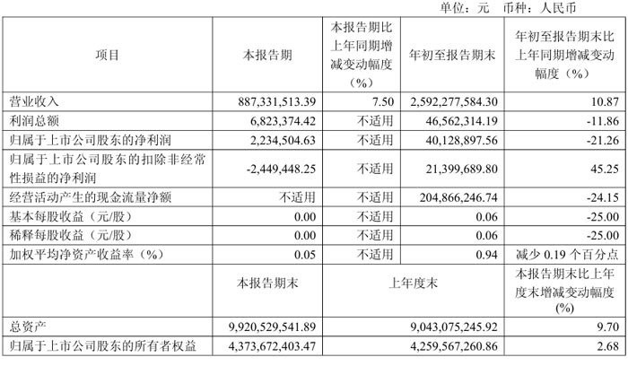每股收益方面,年初至报告期末基本每股收益为 0.06 元 / 股,同比下降 25.00%,与净利润总额变动趋势一致;加权平均净资产收益率为 0.94%,较上年同期减少 0.19 个百分点。