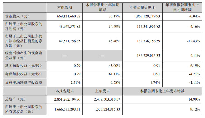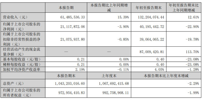 年初至报告期末:累计实现营业收入 24.65 亿元,同比下降 2.26%;归母净利润 5944.52 万元,同比下降 24.66%;扣除非经常性损益后的净利润 4761.59 万元,同比下降 32.10%;基本每股收益 0.1174 元 / 股,同比下降 24.65%。