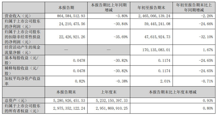 年初至报告期末:累计实现营业收入 24.65 亿元,同比下降 2.26%;归属于上市公司股东的净利润 5944.52 万元,同比下降 24.66%;扣除非经常性损益后的净利润 4761.59 万元,同比下降 32.10%;基本每股收益 0.1174 元 / 股,同比下降 24.65%。