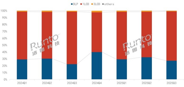 2025年第三季度,智能投影行业迎来关键转折点——曾占据市场主导地位的1LCD技术路线,销量与份额双双呈现“加速下滑”态势。洛图最新数据显示,该季度1LCD线上市场销量占比同比下降4.6个百分点,虽仍以71.7%的份额保持领先,但较一季度0.2个百分点、上半年0.9个百分点的微降幅度,颓势已明显加剧。与之形成强烈反差的是,DLP技术同期份额飙升5个百分点至27.3%,几乎完全承接了1LCD流失的市场空间。这一此消彼长的格局,不仅打破了三季度“1LCD低价产品主导淡季市场”的行业传统,更折射出消费者需求向高端化升级、技术竞争重构市场格局的深层变革。