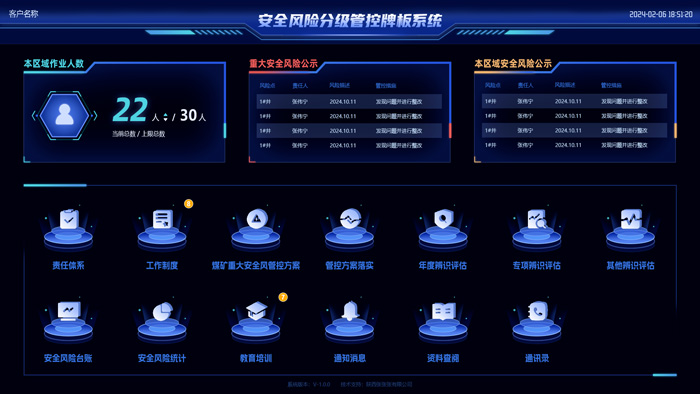 在该系统中,还同时内置了事故隐患排查治理牌板系统和安全风险分级管控牌板系统,则为井下工作披上了双重“防御塔”——事故隐患排查治理牌板系能够实现事故隐患排查与治理的全过程信息化管理,大大降低了事故发生的概率;安全风险分级管控牌板系统则能够识别并评估生产过程中的事故风险,并对其进行动态监测和预警,实现了前置风险预判和预案管理。