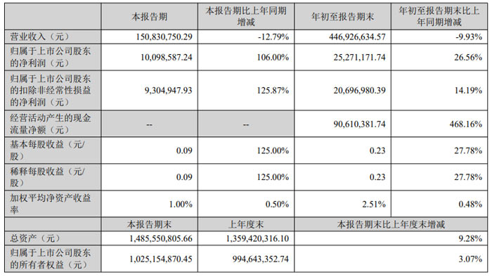 截至 2025 年 9 月 30 日,公司总资产为 32.32 亿元,较上年年末的 32.76 亿元下降 1.37%;归属于上市公司股东的所有者权益为 23.85 亿元,较上年年末的 24.69 亿元下降 3.41%。