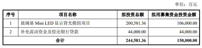 本次募集资金中,10.6 亿元拟投入 “玻璃基 Mini LED 显示背光模组项目”,4.4 亿元用于补充流动资金及偿还银行贷款。其中,玻璃基 Mini LED 显示背光模组项目由公司全资子公司江西德虹实施,总投资 20.06 亿元,建设期 24 个月,达产后将实现年产 605 万片玻璃基 Mini LED 显示背光模组的产能。