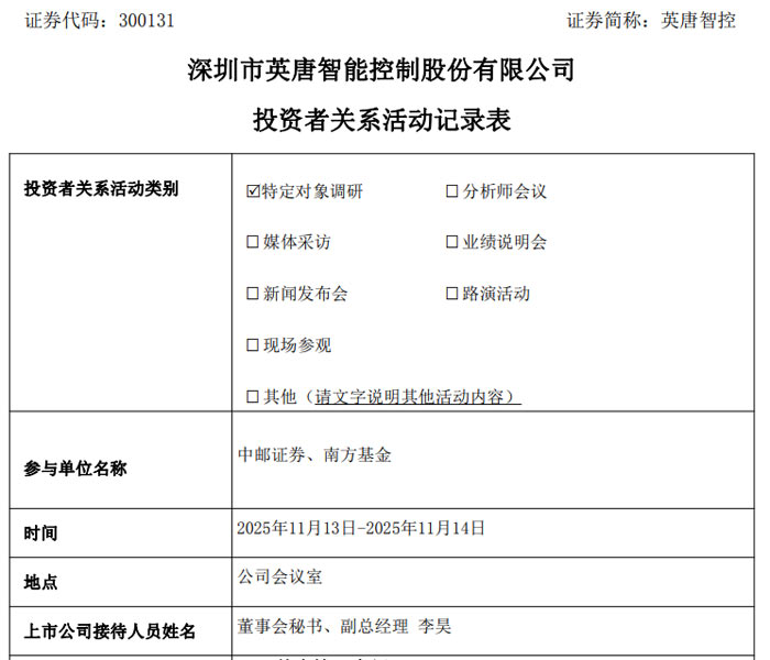 2025 年 11 月 14 日,深圳市英唐智能控制股份有限公司(证券代码:300131,证券简称:英唐智控)举办投资者关系活动,中邮证券、南方基金等机构参与调研。公司董事会秘书李昊详细介绍了发展历程、主营业务及近期并购规划,围绕标的协同价值、业务进展等核心问题与投资者深入交流,彰显公司聚焦半导体 IDM 战略、打造全产业链竞争力的坚定决心。
