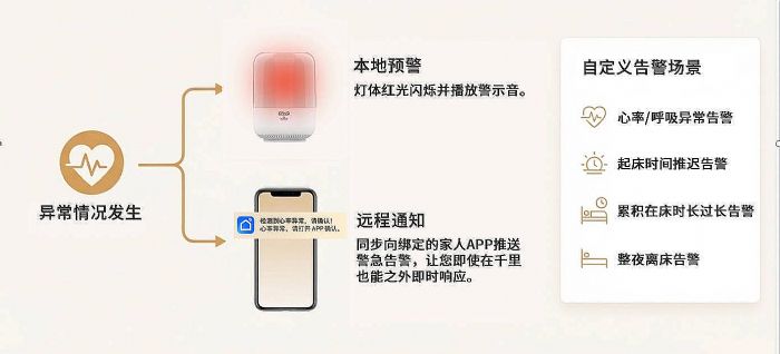 当心率或呼吸数据超出家属预设范围(如心率过速/过缓),灯体会红光闪烁+提示音进行现场提醒,同时同步推送到家属APP,确保信息不遗漏。