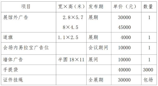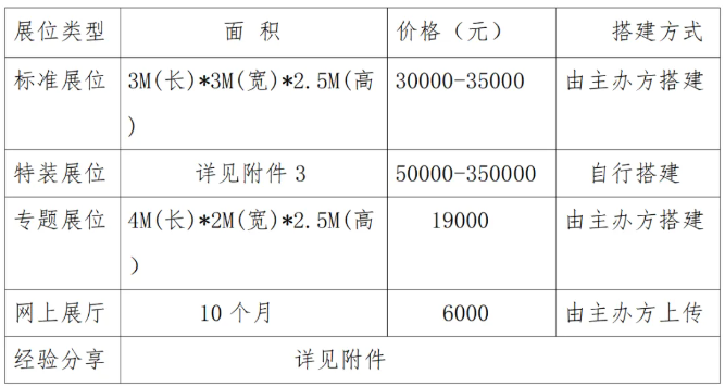说明:标准展位9 M²(3*3),包括三面展板、一张洽谈桌、两把椅子、两支射灯、一个220V*5A电源插座、地毯(需向主办单位提供展位楣板文字,参加线下展赠送网上展)。