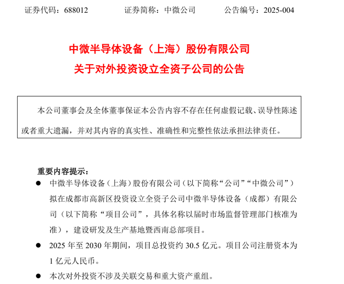 1月15日,中微公司发布公告称呼拟在成都市高新区投资设立全资子公司中微半导体设备(成都)有限公司,建设研发及生产基地暨西南总部项目。2025 年至2030年期间,项目总投资约30.5亿元,项目占地约50亩。项目计划于2025年动工,2027年投产。