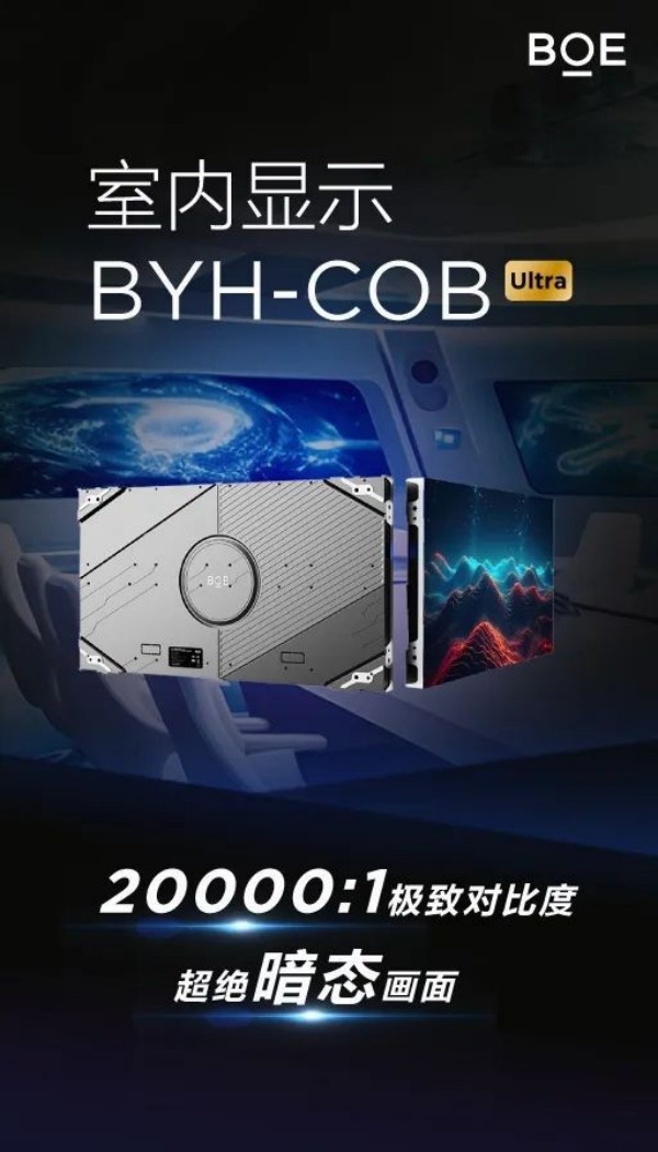 BOE展出20OO:1极致对比度、14.5”大尺寸单模组室内显示BYH-COB,薄膜芯片晶圆级封装Micro MPD,双级亮度、强光也清晰、吊装/壁挂|堆装/直角随意拼的室内显示BSL,烟囱效应高效散热、万级亮度无畏强光户外显示BYB,巴型防护面罩、创意显示BTY、融台虚拟与现实的创意显示BTJ等产品。