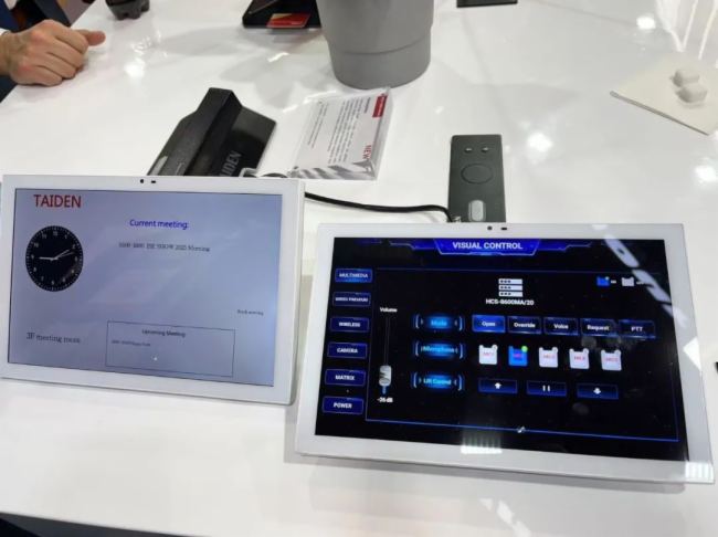今年TAIDEN展位再次优化了参观动线,各系列产品分区展示。在HCS-8600系列无纸化多媒体会议系统 展区,台面式、组合式、嵌入式的无纸化终端陈列有序,超薄的机身配合高清大屏,庄重典雅、科技感满满。观众在会议终端上直接触控图标即实现了签到、文件浏览、会议日程浏览、桌面共享、视频对话、网页浏览以及服务呼叫。如此丰富的会议功能和便捷的操作体验深受现场观众好评!
