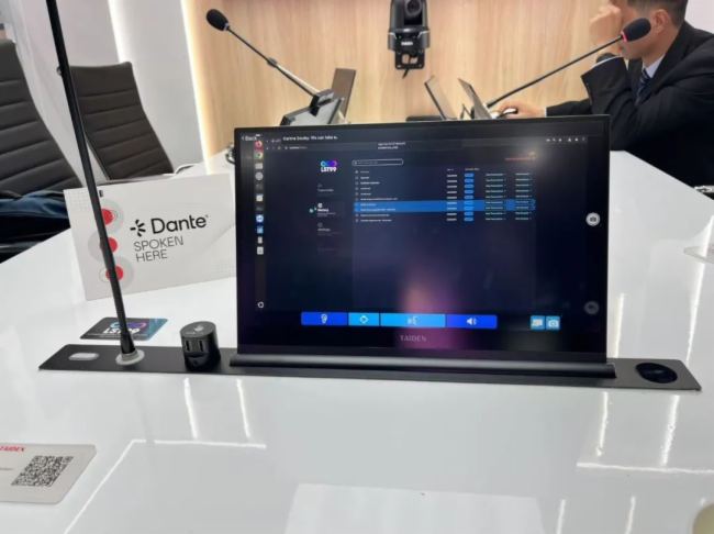 TAIDEN Lab演示区内模拟展示了HyCon混合会议系统 ,现场沉浸式的会议体验也给到访观众留下了深刻的印象。该系统集发言扩声、签到表决、同声传译、摄像跟踪、视频会议、桌面共享、文档共享等功能于一体,线上线下无缝衔接,稳定流畅,音质清晰,能够充分保障远程会议高效开展。