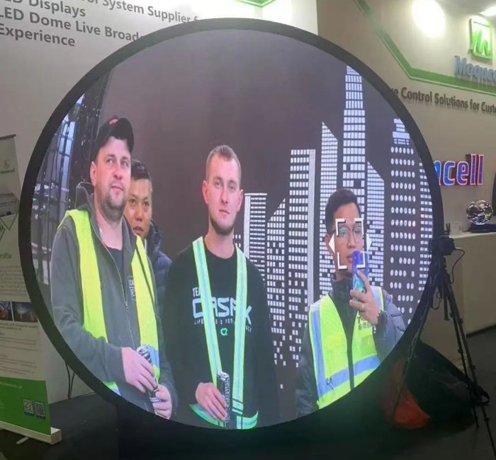 摩西尔内球解决方案作为本场展会的最大亮点,聚焦了观众目光。方案采用摩西尔异形主控独有的动态插值算法,对LED模组进行内球平面展开,利用图像任意角度旋转技术,对每圈物理空隙处进行图像插值填补,使球面图像显示上下左右相互连贯,实现超8K高清显示。