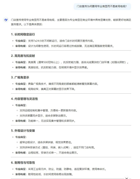 前沿技术正加速赋能工业、能源、政务、文旅等行业,作为发展新质生产力的重要引擎,为各行业提供坚实“智”撑,其特点是创新、关键在质优、本质为先进生产力,助力经济向“新”而行、以“质”致远,未来可期。基于人工智能的时代浪潮背景,飞利浦商显紧跟前沿趋势,通过对话热门AI——DeepSeek的形式,深入剖析门店宣传为何要用专业商显而不是家用电视。