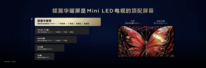 本次供屏第四代液晶电视,TCL华星充分释放了技术积淀,以蝶翼华曜屏赋能旗舰级画质表现。鉴于Mini LED电视依赖于亮度和对比度以提升画质表现,因此配备一块具备高对比度特性的VA屏幕至关重要。此次提供的蝶翼华曜屏,是TCL华星HVA最高配置的屏幕,也是当下最适合Mini LED电视的VA屏。