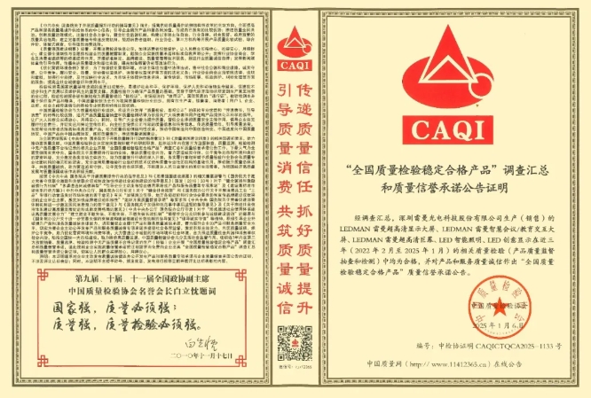 315“国际消费者权益日”如约而至,雷曼光电凭借卓越的产品质量与行业影响力,斩获“全国质量检验稳定合格产品”“全国产品和服务质量诚信承诺企业”“全国行业质量领先企业”等多项权威认证。这不仅是对雷曼光电品质的认可,更是对“中国智造”硬核实力的生动诠释。