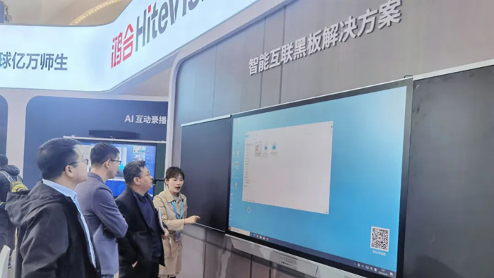 智能互联黑板解决方案展区,鸿合智能互联黑板以“绿色护眼、无界互联”为特色,通过莱茵低蓝光认证面板与4K超广角显示,实现板书无限延展与远程分享;支持课堂内容一键录制、实时互动,满足线上线下混合教学需求。