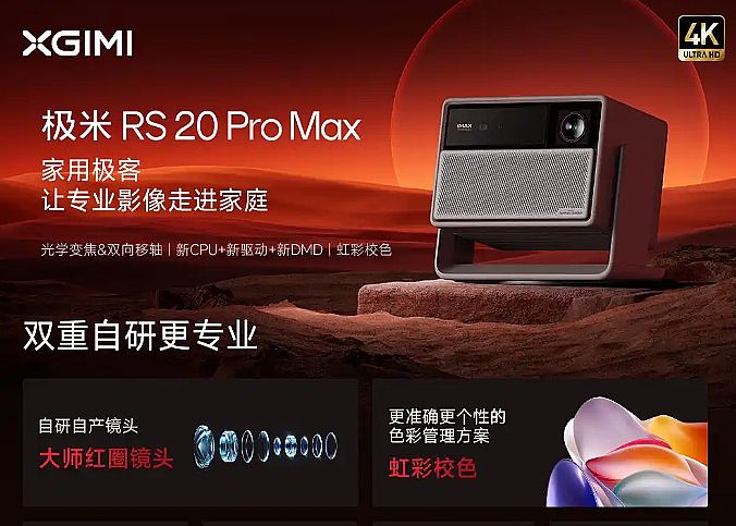 其中,极米RS20系列产品采用1.2-1.5:1光学变焦的大移轴镜头。全系搭载±105%垂直移轴,Promax、Ultra和Ultra大师版则再增加了±40%水平移轴功能。该镜头系列被称为Xmaster Red红圈大师镜头,其均系极米“自研自产”(即极米所讲的“双自”)。