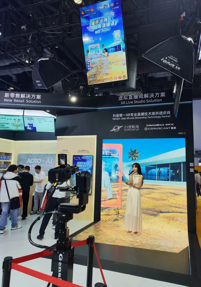 通过MetaBox 4KK虚拟拍摄产品,在展会现场打造了XR虚拟直播间。同时,将这一创新展示与智慧零售深度融合,全方位构建“虚实联动、实时互动、智能转化”为核心特征的新零售数字化解决方案。