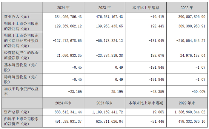 大连智云自动化装备股份有限公司现营业收入为3.84亿元,同比下降19.41%;归属于上市公司股东的净利润为亏损12,936.97万元,同比下降192.44%;经营活动产生的现金流量净额为2,109.09万元,同比增长188.67%;总资产为88,861.23万元,同比下降19.88%;归属于上市公司股东的净资产为49,153.89万元,同比下降21.44%。