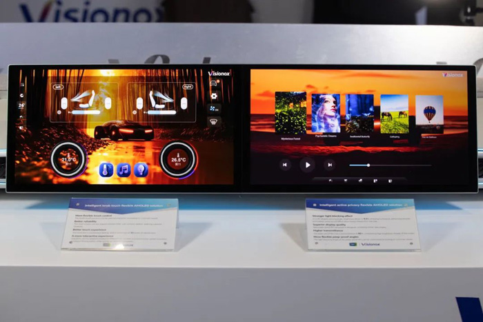 维信诺智能C型扶手柔性AMOLED解决方案,固态曲面角度130°,更贴合车内结构与驾乘需求。车规级触控芯片,触控灵敏且响应速度快,让交互智能与安全拉满。维信诺车载双联屏一体化柔性AMOLED解决方案,高品质的拼接工艺叠加搭载了一体化模组材料,双屏浑然一体;同时优化了“双屏一体黑”显示效果,色彩还原精准,画面细腻逼真。整机设计满足车规防水、防尘、震动等严苛测试。