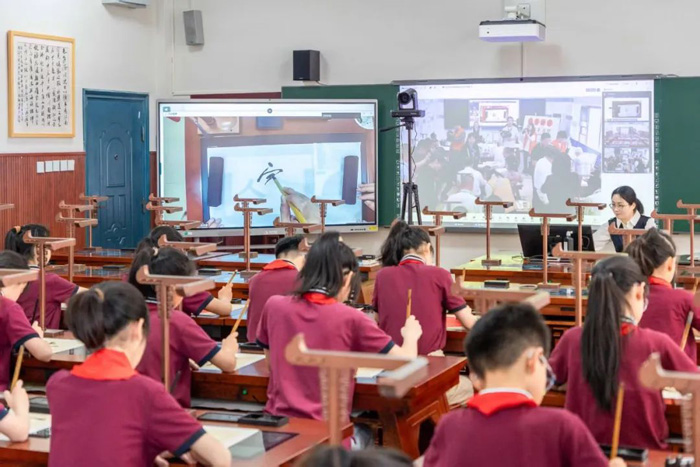 5月15日,沌口小学向现场嘉宾和观看直播的线上观众展现了学校在智慧书法教育上的成果,在光峰教育投影的高清显示支持下,实现沌口小学的孩子们与湖北开放大学的老年大学生跨代跨时空同屏互动。与会嘉宾直观感受到了数字技术赋能传统艺术教学的创新路径,学生在互动体验中展现出对书法文化的浓厚兴趣,圆满完成了传统与现代科技融合的教学示范。