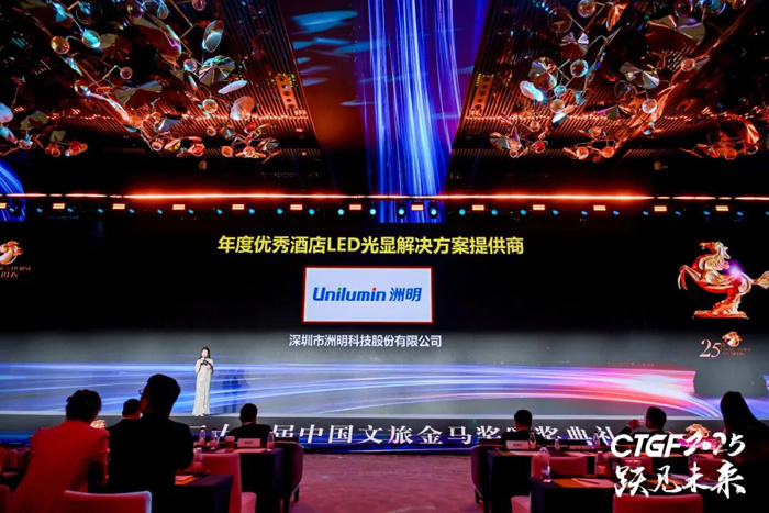 洲明科技受邀参会,展出自研创新成果——U-Natural纹理屏,并凭借在文旅场景中的深度布局与项目经验,荣获“年度优秀酒店LED光显解决方案提供商”大奖,持续引领光显科技与文旅产业的融合发展。