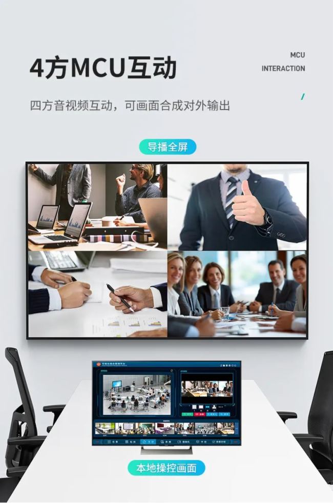 5、视频会议终端:内置4方MCU互动,支持SIP/H.323协议,一键组会。