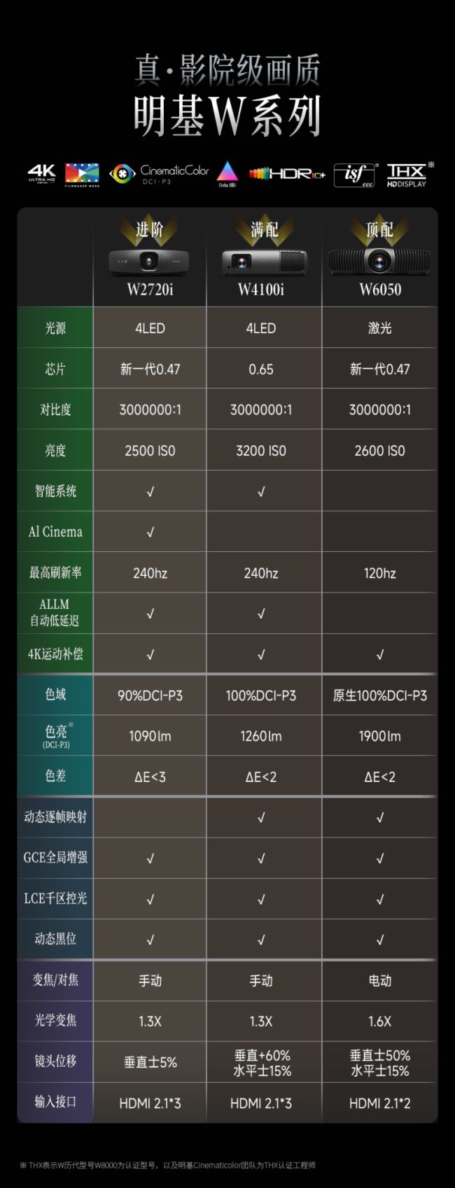 值得关注的是,明基此次的技术升级,并非孤立的产品迭代,而是覆盖了不同层级的市场需求。从入门级的W2720i到专业级的W4100i,再到旗舰级的W6050 ,这种阶梯式产品布局既满足了普通用户搭建客厅影院的基础需求,也为影音发烧友提供了客制化的私人影院解决方案。无论是从色彩还原度、动态解析力,还是定制影院设计等方面而言,明基W系列都真正做到了将商业影院搬回家。