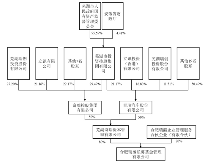 据介绍,合肥瑞丞的控股股东为奇瑞资本,奇瑞资本持有合肥瑞丞 80%股权,奇瑞资本的股东为奇瑞控股、奇瑞股份,各持 50%股权。其中,奇瑞控股前三大股东分别为芜湖市投资控股集团有限公司、芜湖瑞创投资股份有限公司、立讯有限公司,分别持有奇瑞控股 29.47%股权、27.20%股权、21.16%股权,股权较为分散,不存在控股股东,亦无单一股东能够控制董事会大多数成员的组成或董事会的决策。奇瑞股份前三大股东分别为芜湖市投资控股集团有限公司、立讯有限公司、芜湖瑞创投资股份有限公司,分别持有奇瑞股份 21.17%股权、16.83%股权、11.51%股权,股权较为分散,不存在控股股东,亦无单一股东能够控制董事会大多数成员的组成或董事会的决策。因此,奇瑞资本无控股股东、无实际控制人。