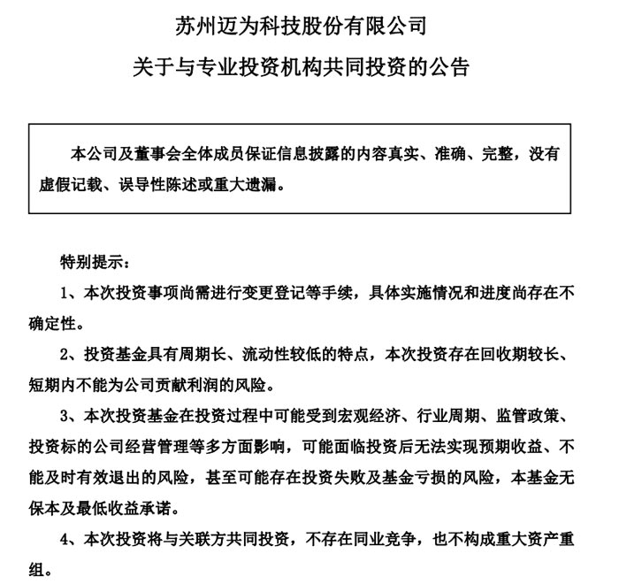 迈为股份表示,本次投资是基于公司战略规划需要,旨在借助专业基金管理团队的力量整合各方资源,发掘工业互联网领域内具有高成长潜力的优质项目。短期来看,投资将占用公司一定资金,但不会对正常运营产生重大不利影响;长期若基金投资成功,将为公司带来可观投资收益,提升盈利能力与市场竞争力,同时助力公司与行业优秀企业建立合作,推动业务多元化发展与产业布局优化。本次投资资金来源于公司自有资金,合作投资主体不纳入公司合并报表范围,不会对公司财务及经营状况产生重大影响。