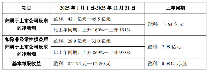 根据业绩预告,2025 年 1 月 1 日至 2025 年 12 月 31 日期间,公司归母净利润预计为 416,000 万元至 456,000 万元,上年同期该数据为 115,443.11 万元,同比增长幅度介于 260.35% 至 295.00% 之间;扣非净利润预计为 415,000 万元至 455,000 万元,上年同期为 114,139.33 万元,同比增长 263.59% 至 298.64%。