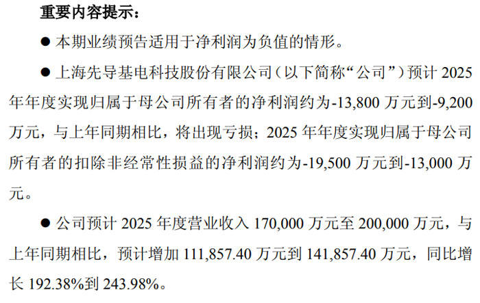 1 月 20 日,上海先导基电科技股份有限公司(证券代码:600641,证券简称:先导基电)发布 2025 年年度业绩预告(公告编号:临 2026-002)。公告显示,公司 2025 年营业收入实现跨越式增长,但受多项战略性投入及财务因素影响,净利润预计出现亏损,相关业绩数据未经注册会计师审计。
