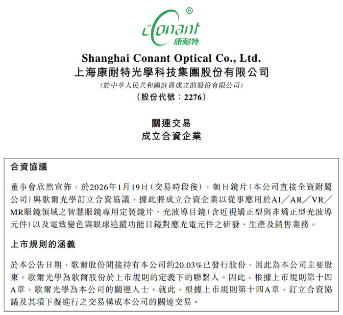 2026 年 1 月 19 日交易时段后,上海康耐特光学科技集团股份有限公司(以下简称 “康耐特光学”,股份代号:2276)公告宣布,其直接全资附属公司朝日镜片控股有限公司(以下简称 “朝日镜片”)与歌尔光学科技 (香港) 有限公司(以下简称 “歌尔光学”)正式订立合资格协议,双方将携手成立合资企业 —— 歌尔光视科技 (香港) 有限公司,共同深耕 AI/AR/VR/MR 眼镜领域的光学产品研发、生产及销售业务。