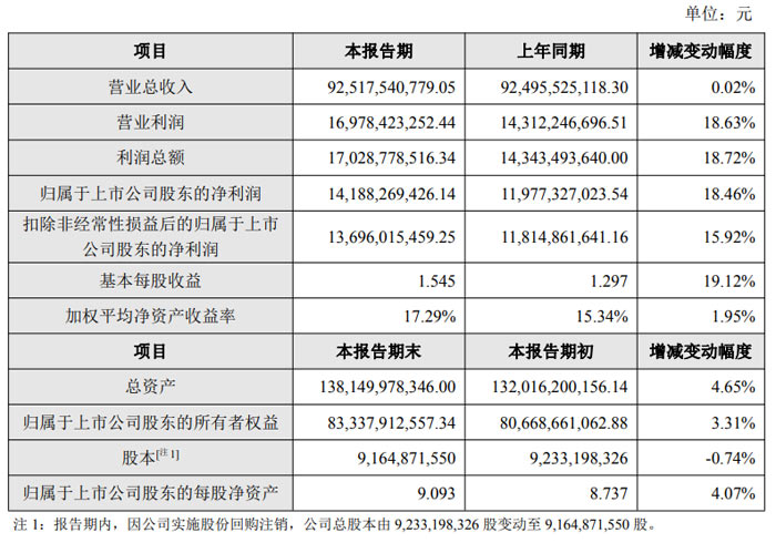 财务状况方面,截至 2025 年末,公司总资产达 138,149,978,346.00 元,较期初的 132,016,200,156.14 元增长 4.65%;归属于上市公司股东的所有者权益为 83,337,912,557.34 元,较期初的 80,668,661,062.88 元增长 3.31%;归属于上市公司股东的每股净资产 9.093 元,较期初的 8.737 元增长 4.07%。值得注意的是,报告期内公司实施股份回购注销,总股本由 9,233,198,326 股变动至 9,164,871,550 股,变动幅度为 - 0.74%。