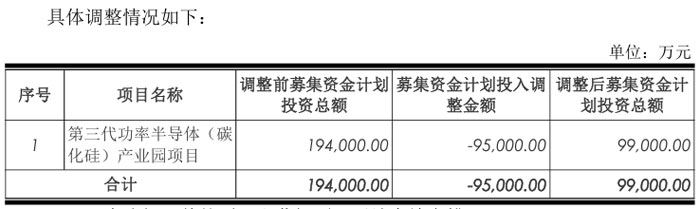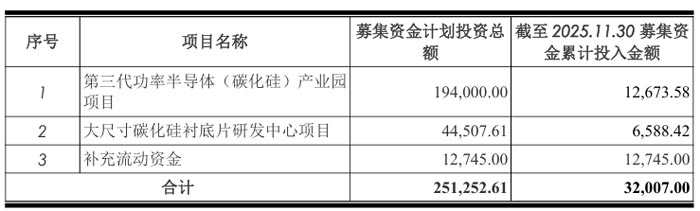 根据最初规划,募集资金主要投向三大项目:第三代功率半导体 (碳化硅) 产业园项目(计划投资 19.4 亿元)、大尺寸碳化硅衬底片研发中心项目(计划投资 4.45 亿元)以及补充流动资金(计划投资 1.27 亿元)。截至 2025 年 11 月 30 日,上述项目累计投入募集资金 3.2 亿元,其中碳化硅产业园项目投入 1.27 亿元,研发中心项目投入 0.66 亿元,补充流动资金项目已全额投入。