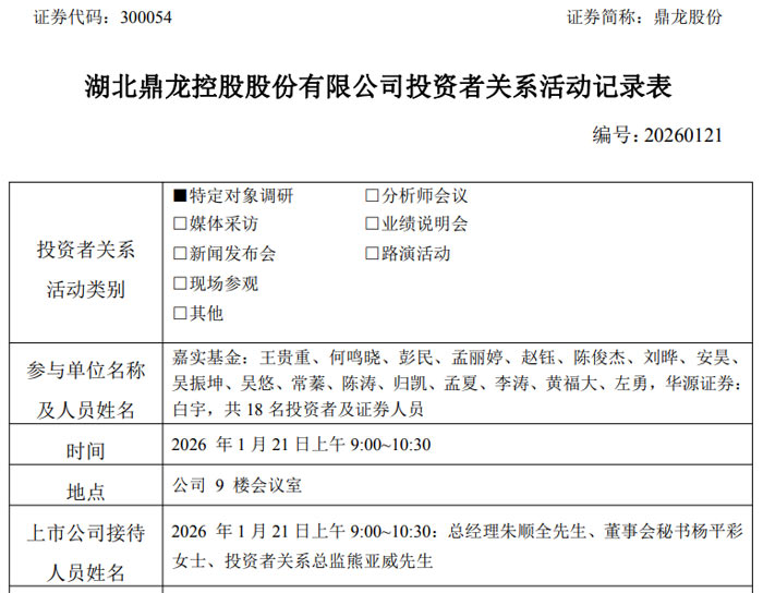 2026 年 1 月 21 日上午 9:00-10:30,湖北鼎龙控股股份有限公司(证券代码:300054,证券简称:鼎龙股份)举办特定对象调研活动,接待了嘉实基金、华源证券等机构的 18 名投资者及证券人员。公司总经理朱顺全先生、董事会秘书杨平彩女士、投资者关系总监熊亚威先生出席活动,就公司业务布局、核心竞争力、研发规划及行业机遇等问题与调研机构进行深入交流。