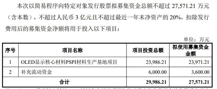 根据募集说明书,本次募集资金扣除发行费用后,23,971.21 万元将投入 OLED 显示核心材料 PSPI 材料生产基地项目,3,600 万元用于补充流动资金。其中,PSPI 材料生产基地项目由公司全资子公司奥来德长新实施,建设期预计 3 年,达产后将新增 1,000 吨 PSPI 材料产能,可有效提升公司规模化量产能力及市场供应能力。