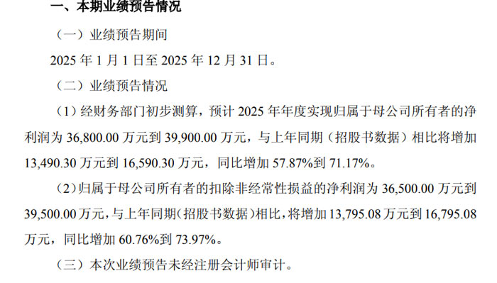 归属于母公司所有者的净利润预计为 36,800.00 万元至 39,900.00 万元,较上年同期(招股书数据)增加 13,490.30 万元至 16,590.30 万元,同比增幅达 57.87% 至 71.17%;