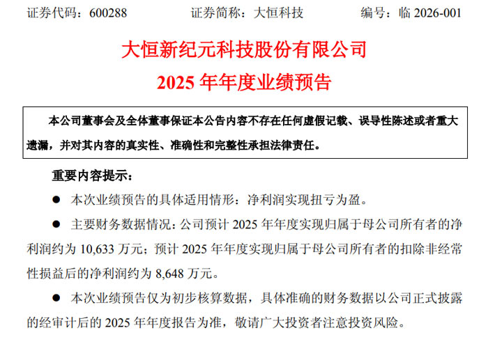 近日,大恒新纪元科技股份有限公司(证券代码:600288,证券简称:大恒科技)发布 2025 年年度业绩预告(编号:临 2026-001)。业绩预告显示,公司 2025 年年度业绩实现显著改善,成功扭亏为盈。