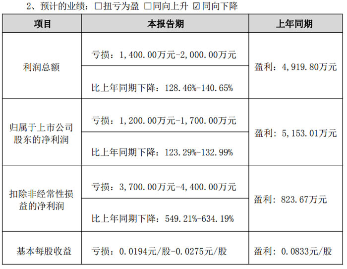 归属于上市公司股东的净利润预计亏损 1200.00 万元 - 1700.00 万元,上年同期为盈利 5153.01 万元,同比下降 123.29%-132.99%;