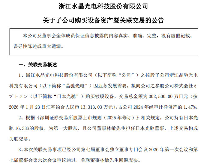 近日,浙江水晶光电科技股份有限公司(证券代码:002273,简称 “水晶光电”)发布公告称,其控股子公司浙江晶驰光电科技有限公司(简称 “晶驰光电”)为满足业务发展需求,拟向公司参股公司株式会社オプトラン(英文名称:OPTORUN CO., LTD,简称 “日本光驰”)购买镀膜设备,交易总金额达 302,500.00 万日元,按 2026 年 1 月 23 日汇率折算约合人民币 13,313.03 万元,占水晶光电 2024 年经审计净资产的 1.47%。